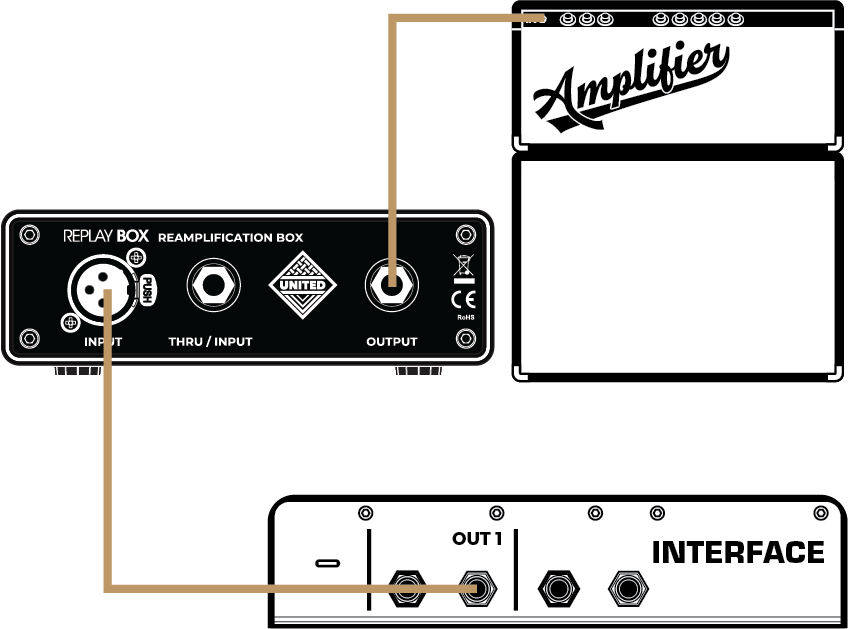 Pro tip: We recommend using as short of a cable as possible to connect the Replay Box to an amplifier. The connection between playback source (interface / tape machine / etc) can be as long as needed. This ensures the highest quality unbalanced instrument signal into the amplifier.